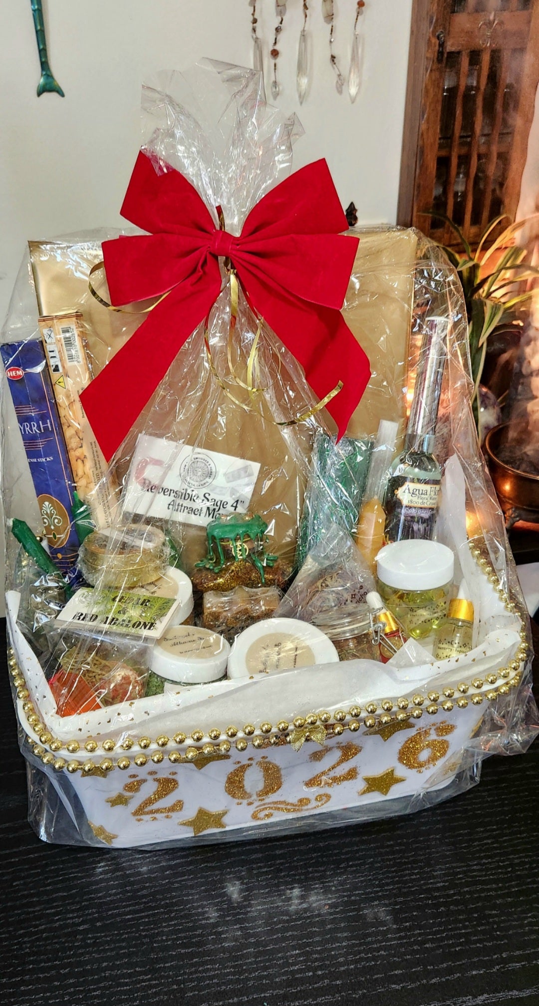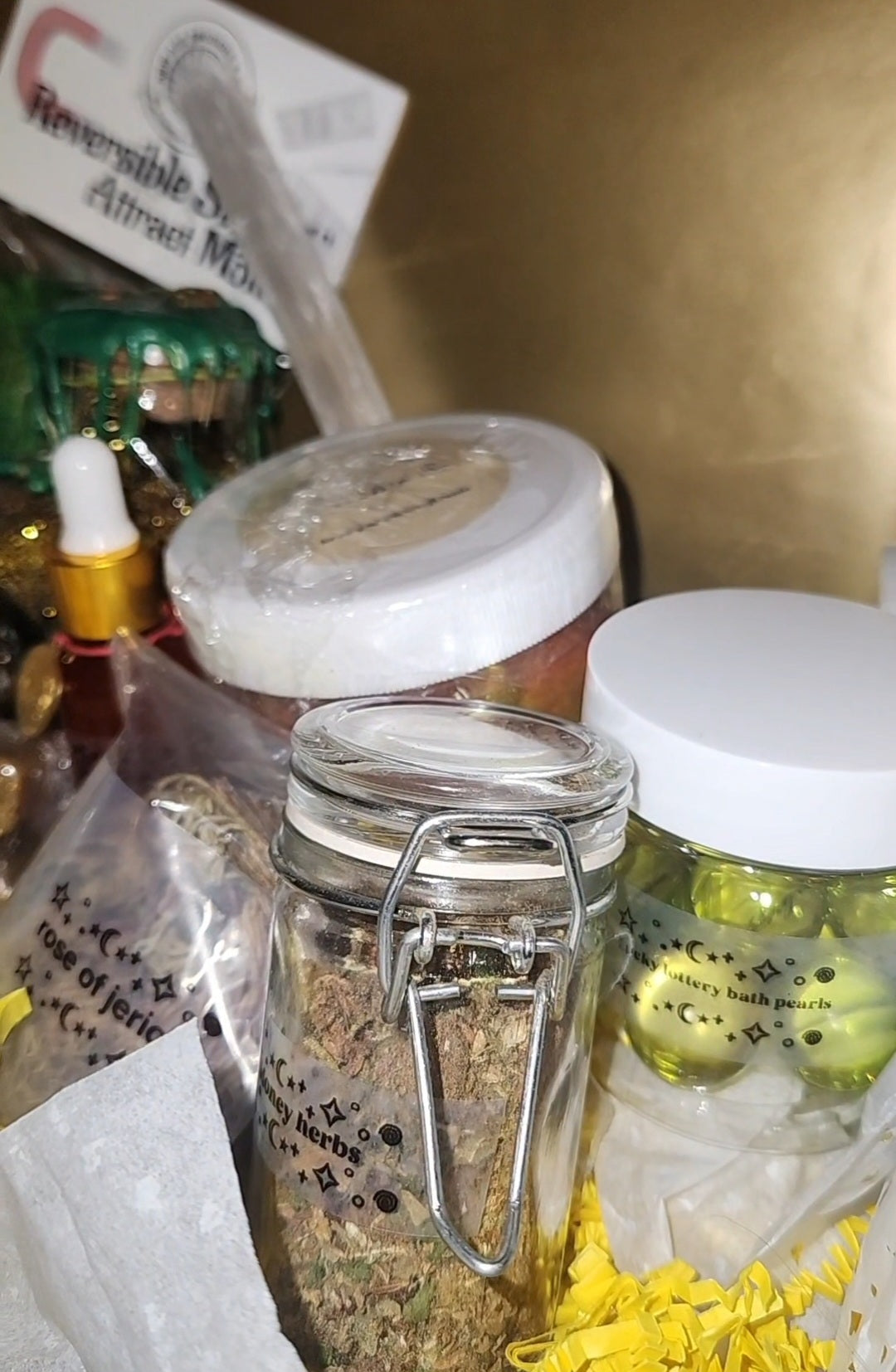 Contains all you need from spell oil infused bath pearls to candles, to a jar made for manifesting, and a calcite tower ! This kit is jam packed with several items made to use during new years eve so you can manifest money, luck, attraction and ease all year around!