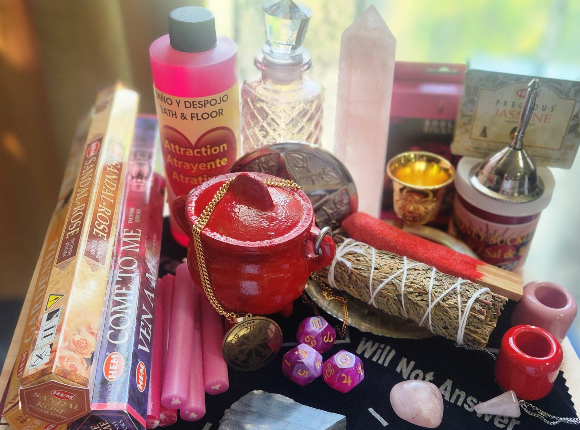 A smell kit with several items correlating to love! Including a 7 inch rose quartz tower, couldron, incense, pendulums, 2 chime holders and more ♥️